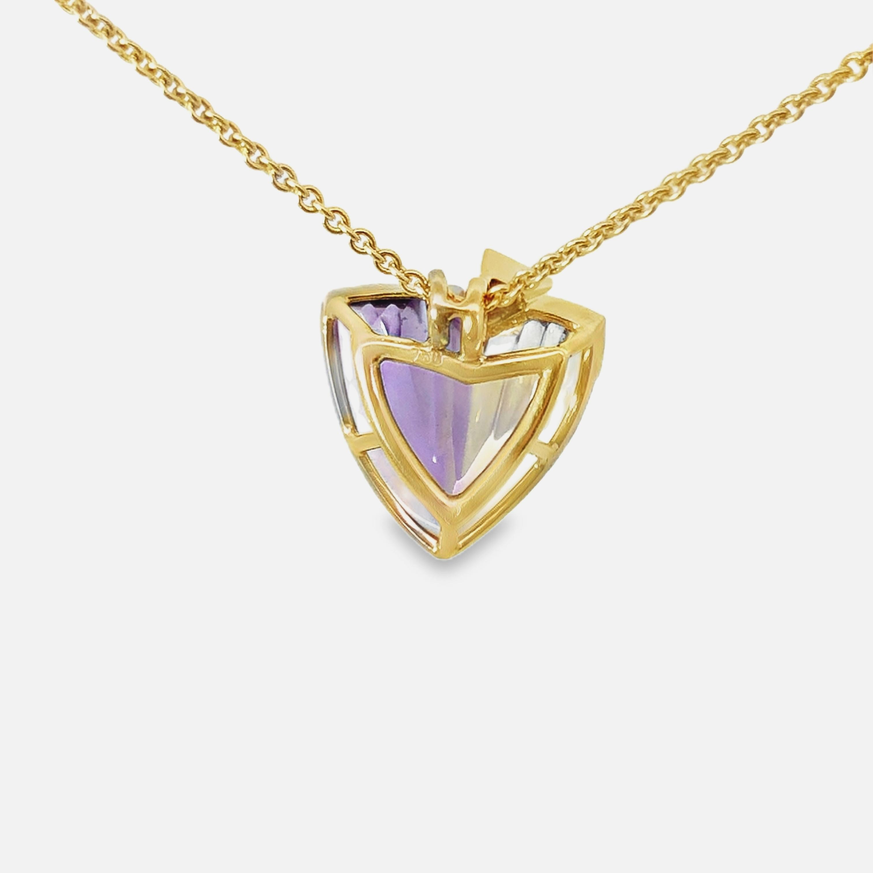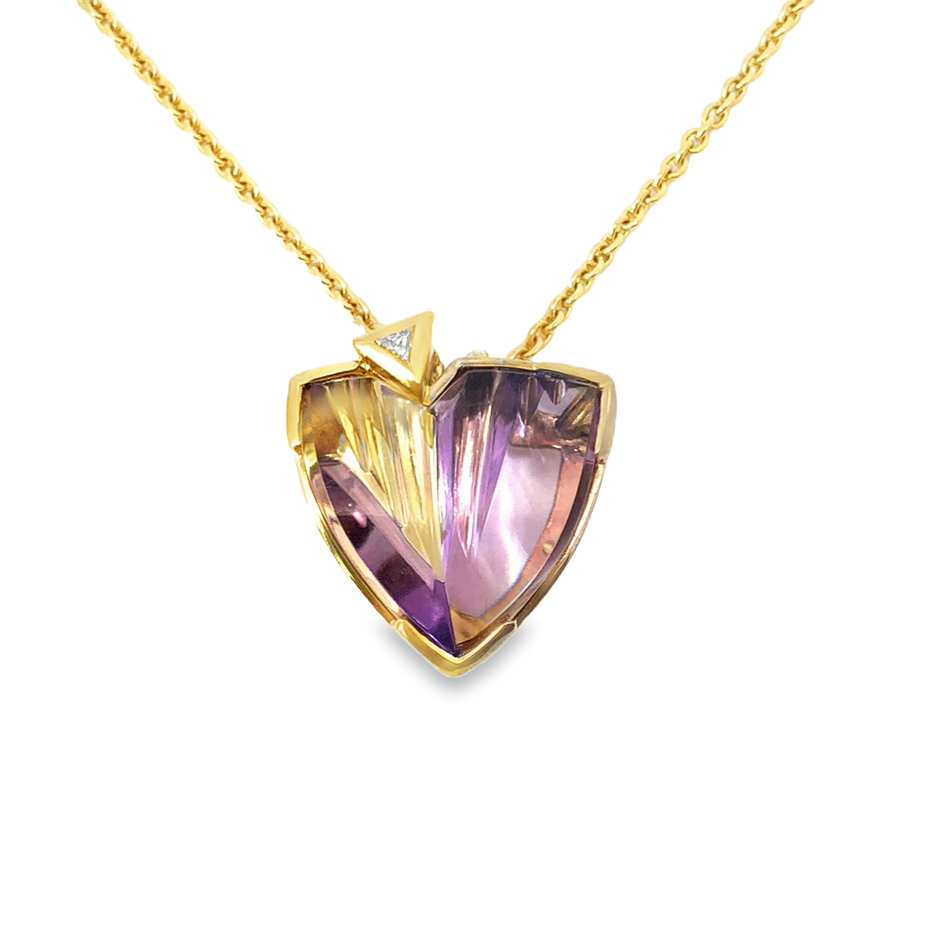 Anhänger Modellnummer HDLT SCHMUCK 079 kombiniert edles 750er Gold mit einem faszinierenden Ametrin und funkelnden Diamanten. Dieser brillante Anhänger verleiht jedem Outfit einen Hauch von Eleganz und Raffinesse. Ideal für besondere Anlässe, kann er mit einer filigranen Goldkette getragen werden, um den Hals zu schmeicheln und das Schmuckstück hervorzuheben. Perfekt als stilvolles Highlight.
