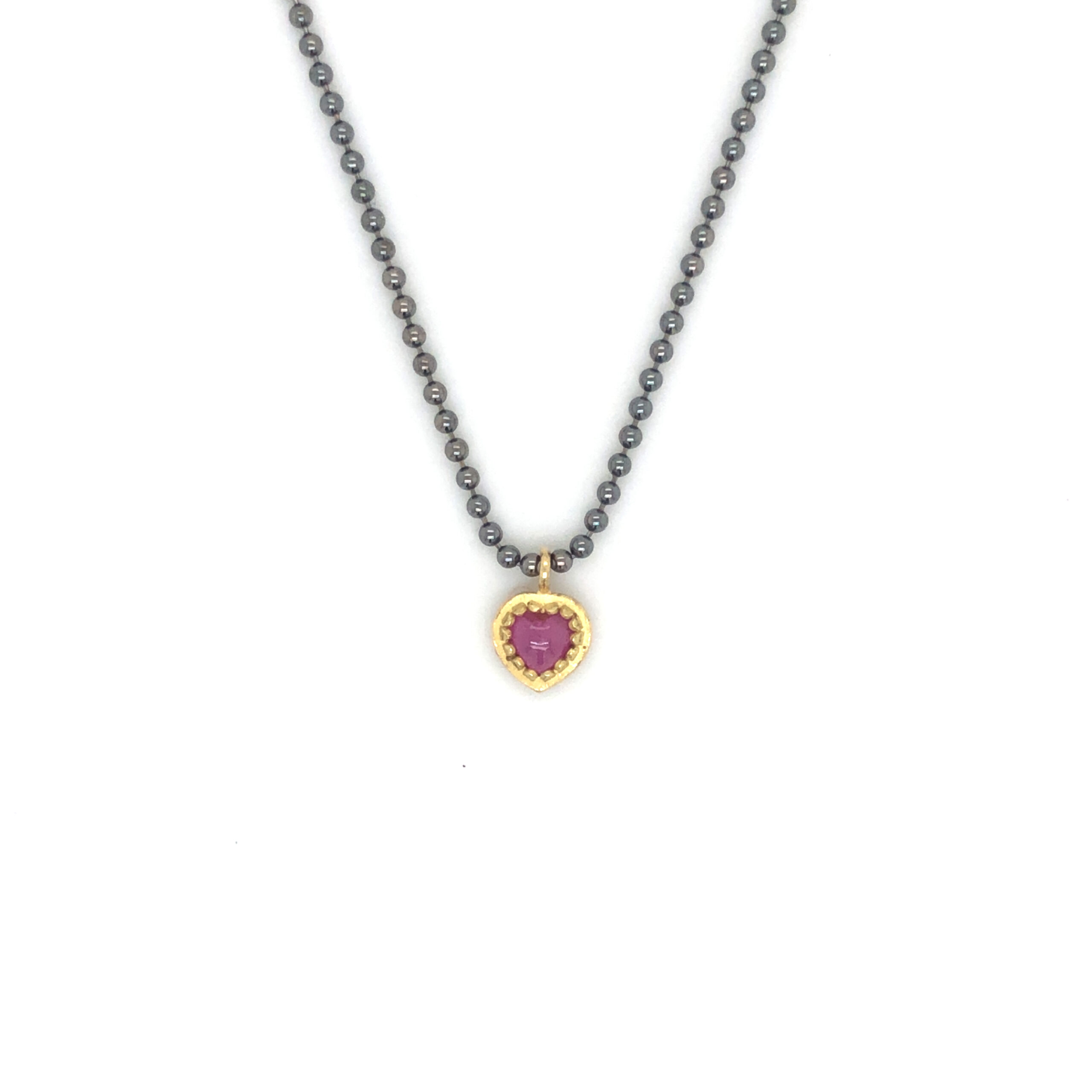 Anhänger Herz in Gelbgold 750/ooo mit einem Grönland Rubin - fairmined -. facettierte Kugelkette 42cm in Silber 925 oxidiert