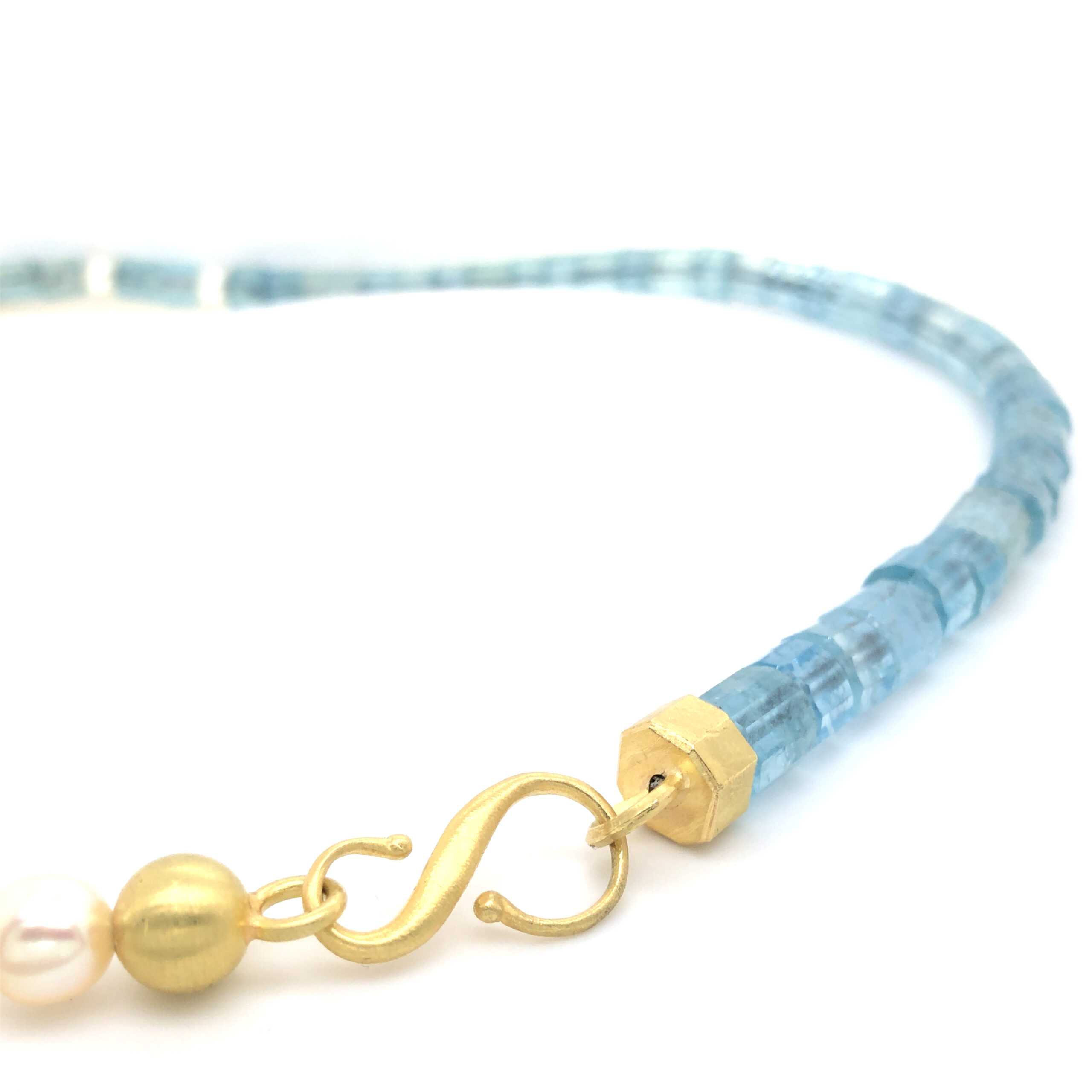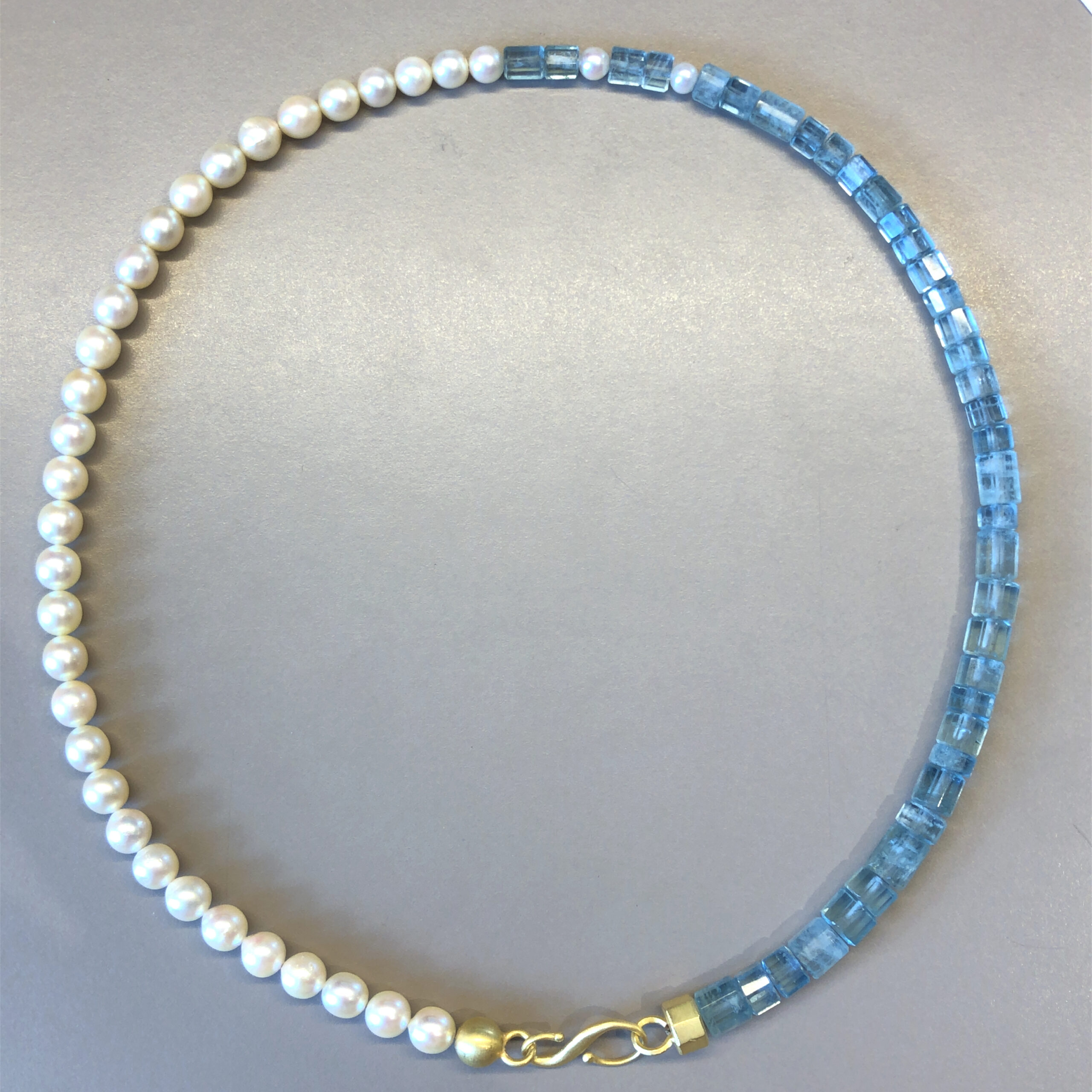 Aquamarine facettiert in einem intensiven Blauton. Akoya Zuchtperlen, 7,5mm. Länge 42cm. Die Schließe wird leicht seitlich nach vorne getragen.
