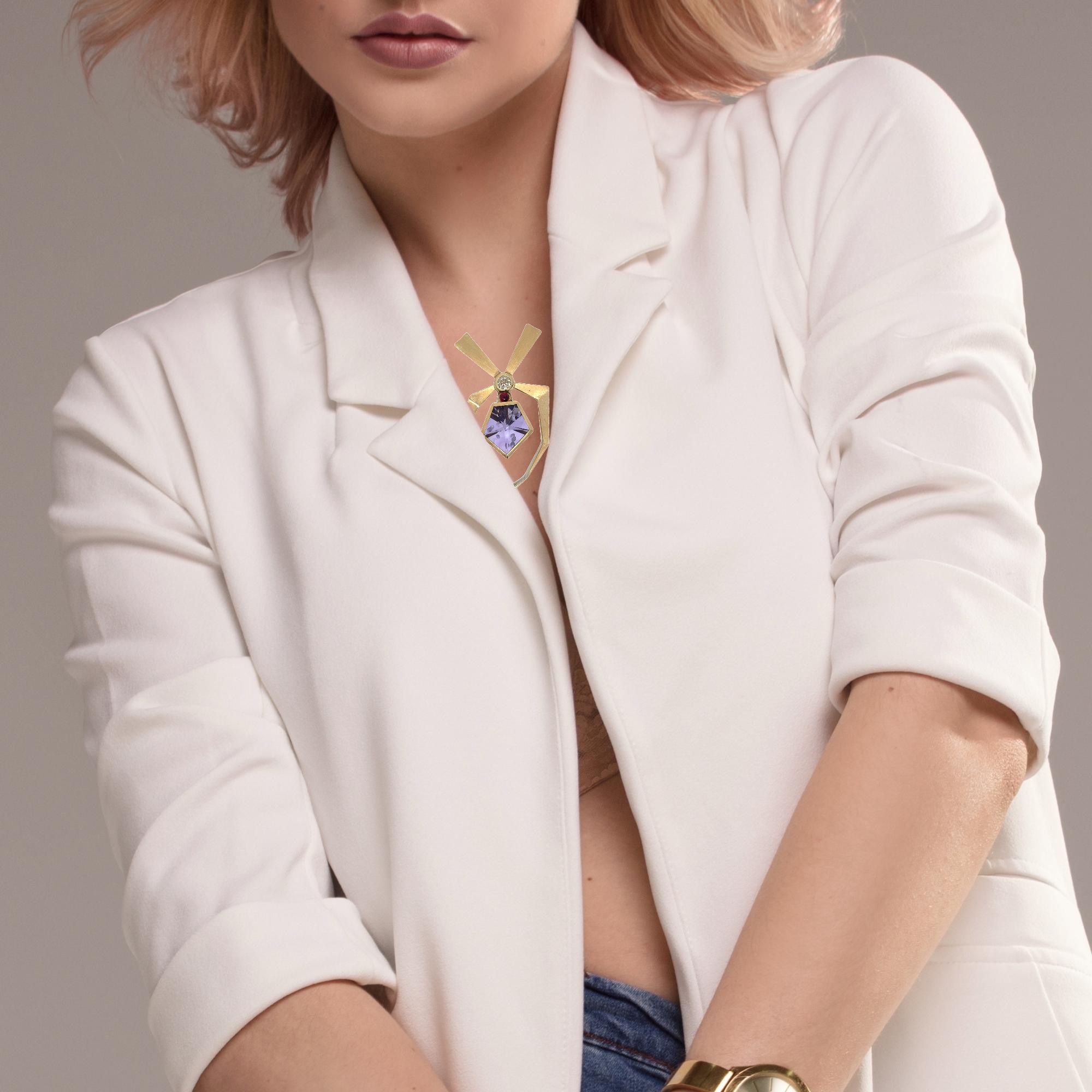Diese wunderschöne Collierschließe besteht aus Roségold 750 und ist mit einem Amethyst und einem Rubin besetzt. Die Wechselschließe ermöglicht es, sie einfach an verschiedenen Ketten zu tragen. Tragen Sie sie als Blickfang in der Mitte Ihres Dekolletés oder als elegante Verzierung am seitlichen Verschluss Ihrer Kette. Eine elegante und vielseitige Ergänzung zu Ihrem Schmucksortiment.