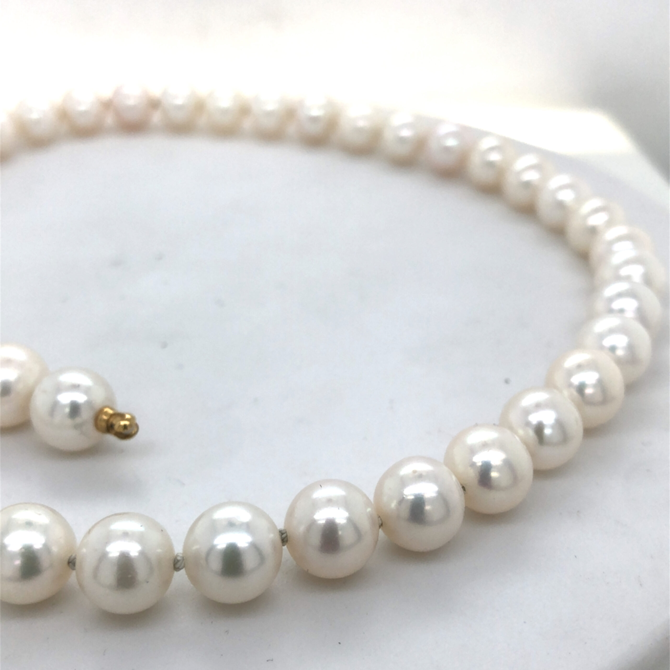 Klassisches Perlcollier, durchgeknotet auf hochfester Teilsynthetikseide, finiert mit Wechselschließenmechanik in Gelbgold 750/ooo, 51 Süsswasserperlen mit sehr gutem Lüster, annähernd Rund,  8 bis 8,2mm Durchmesser, Länge 43cm