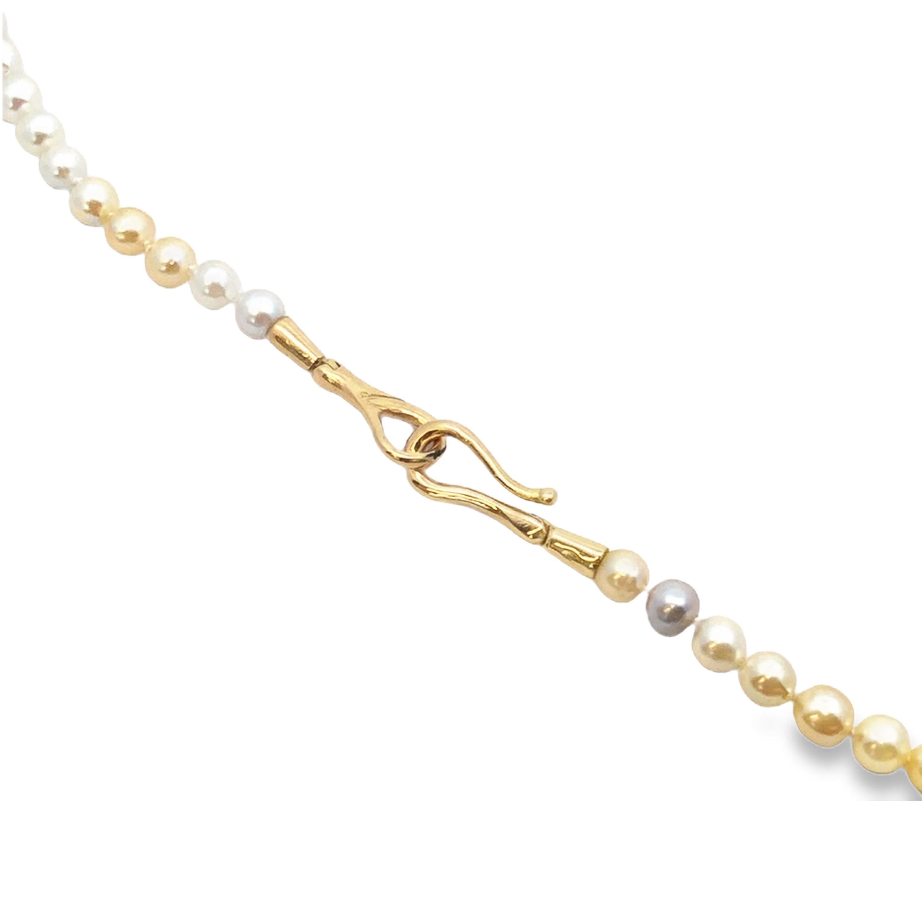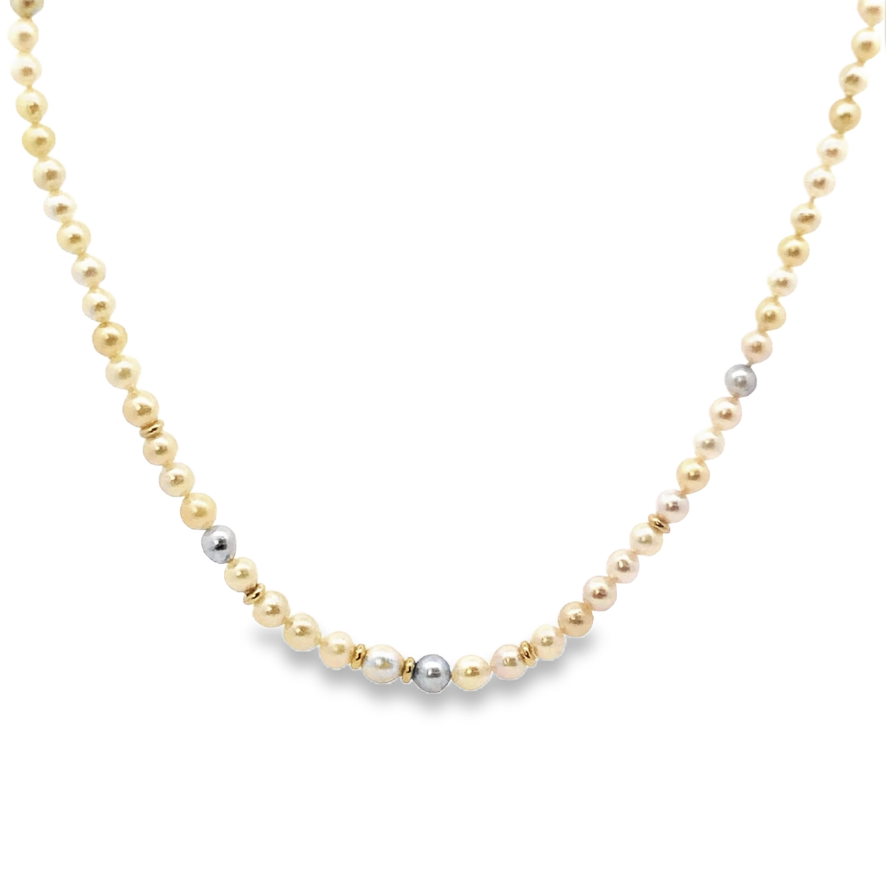 Diese Perlenkette mit verschieden farbigen Akoya Zuchtperlen aus dem japanischen Meer ist ein zeitloses Schmuckstück, das in hochwertigem Gold 750 gefertigt ist. Diese Halskette hat eine Länge von 470 mm und hat eine leicht zu bedienende Haken/Öse Schließe, welche ebenfalls im KISSNER Meisteratelier gefertigt wurde. Auf wünsch kann die Länge angepasst werden. Ideal zur Veredelung eleganter Outfits, lässt sie sich sowohl zu festlichen Anlässen als auch im Alltag mit klassischen oder modernen Outfits kombinieren. Es handelt sich hierbei um ein UNIKAT: