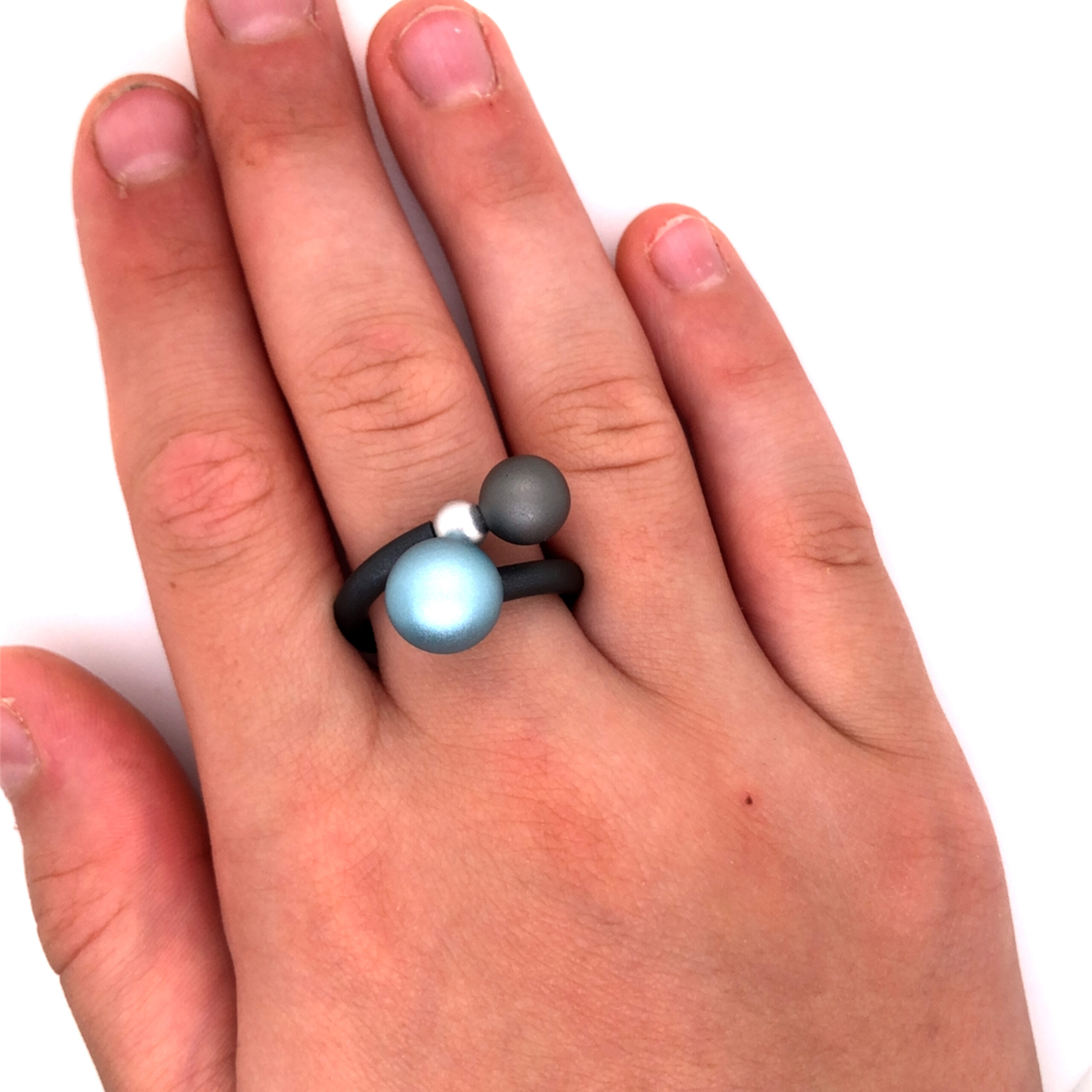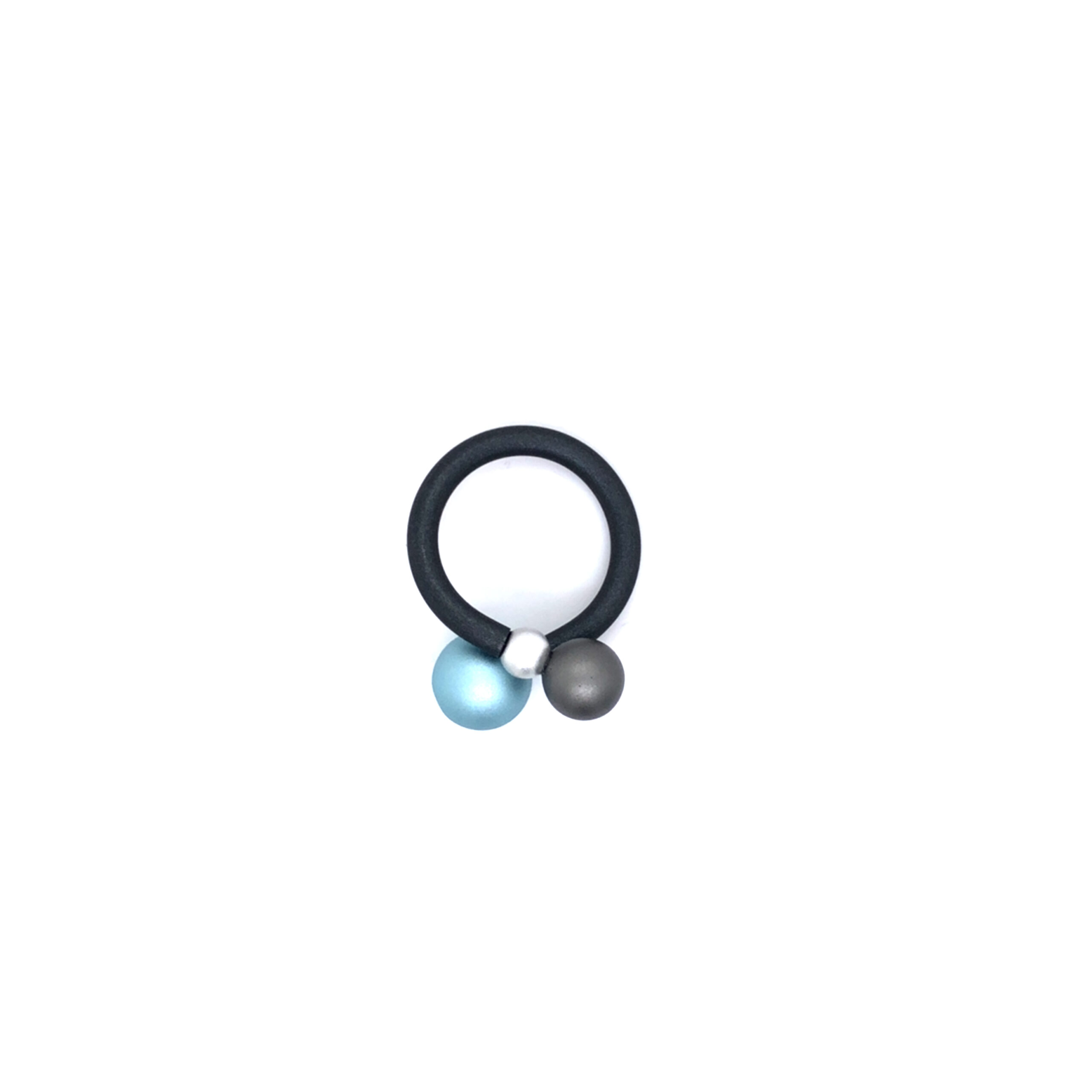 Ring aus Kautschuk und Aluminium eloxiert in hellblau, silber, grau.