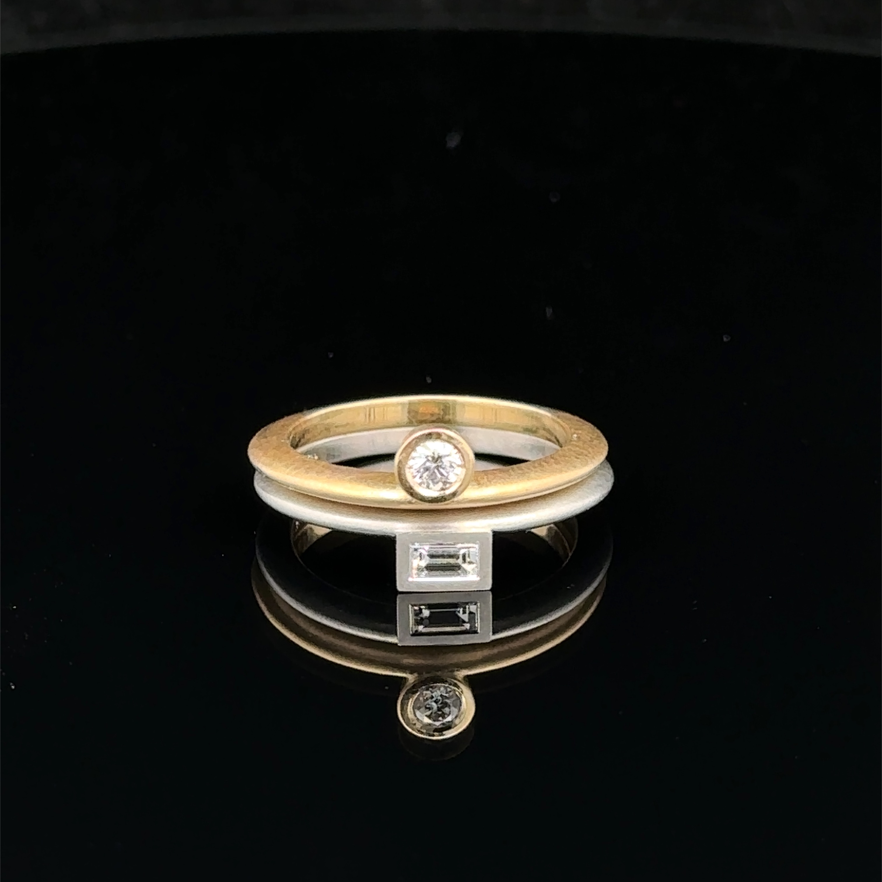 Dieser Ring aus 750/- Gelbgold mit einer Ringschiene mit Hochovalem Profil trägt an der Seite einen Brillanten von 0,1ct TW-SI. Dieser Ring ist als Vorsteckring konzipiert eine Variante in Platin mit Baguette Diamant ist ebenfalls erhältlich, gehört jedoch nicht zum Artikel.  Ein Must-Have für jede Schmucksammlung!