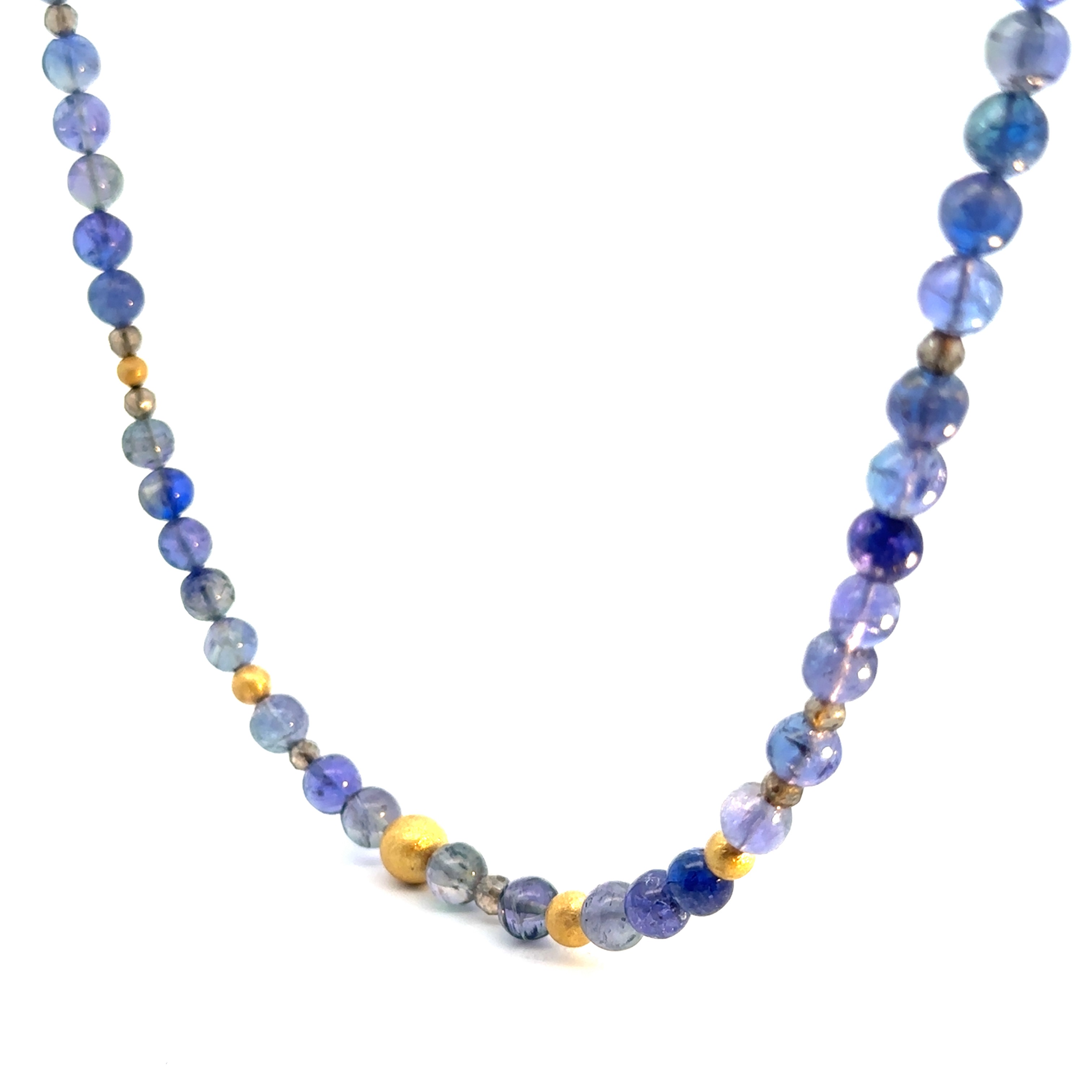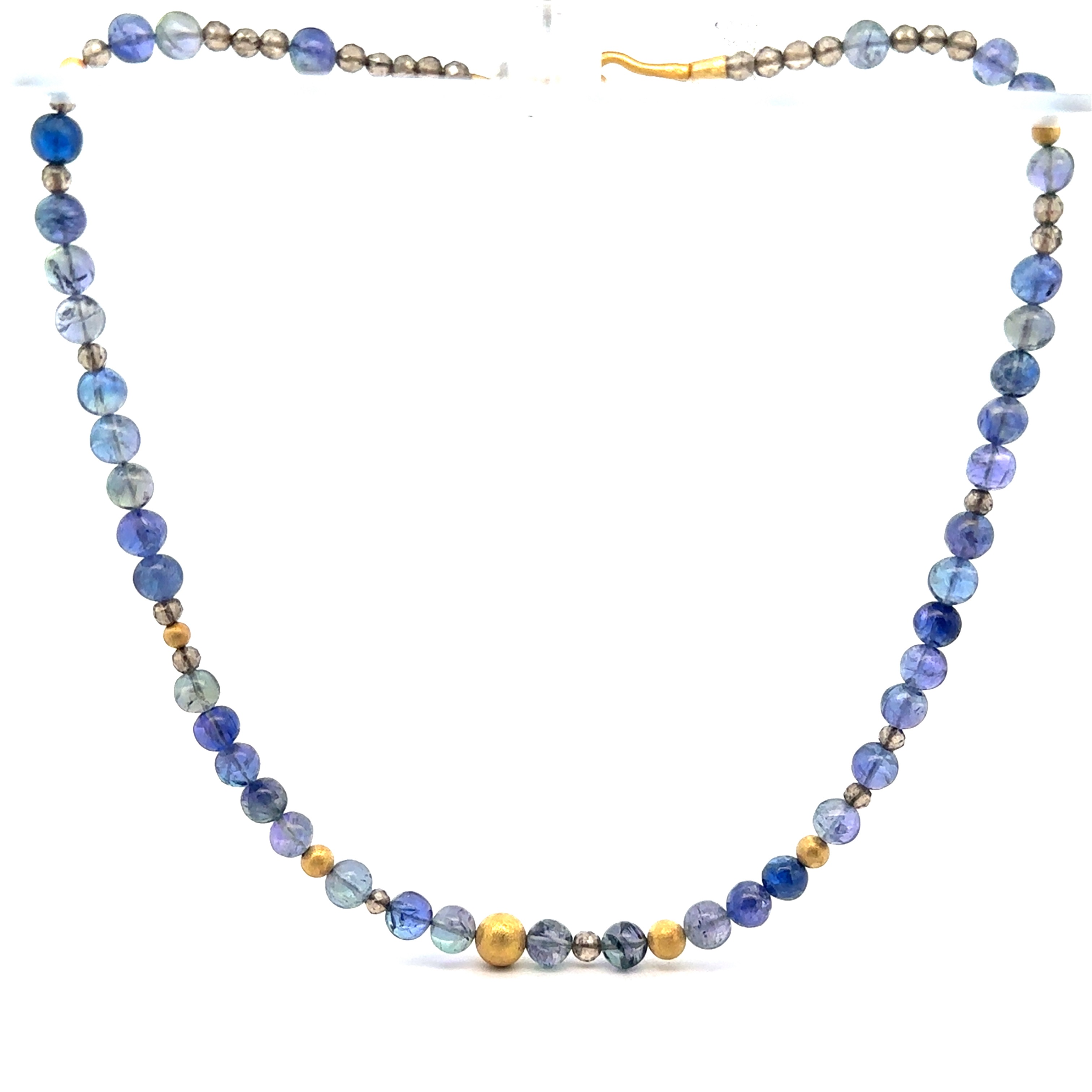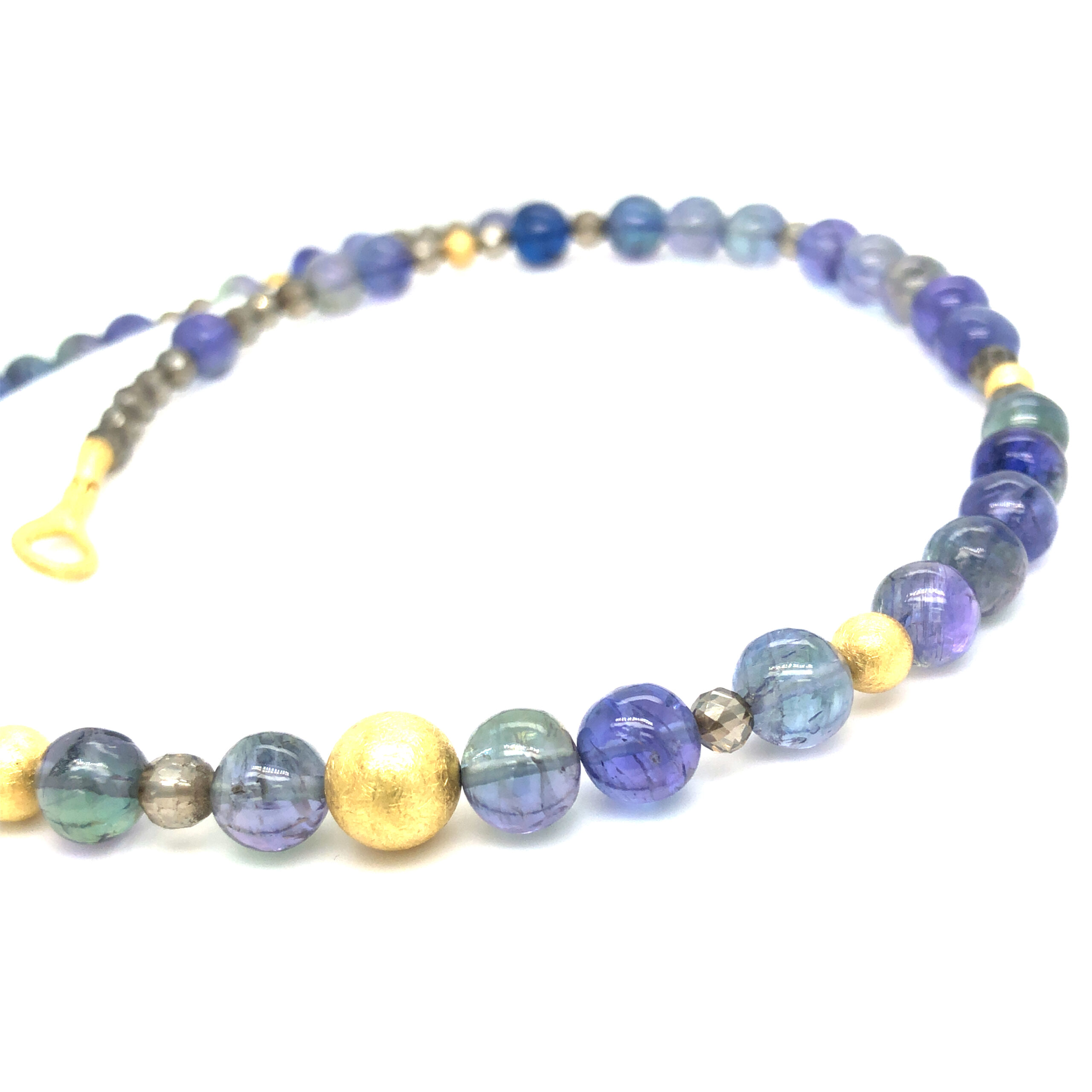 Diese Steinkette besteht aus Gelbgold 750 und enthält Tansanitkugeln in changierendem Grün-Blau sowie Labradorit. Sie kann als elegantes und vielseitiges Schmuckstück sowohl im Alltag als auch zu besonderen Anlässen getragen werden. Die Kombination der verschiedenen Edelsteine verleiht der Kette einen einzigartigen Look und zieht garantiert alle Blicke auf sich. Ein Must-have für jede Schmucksammlung!